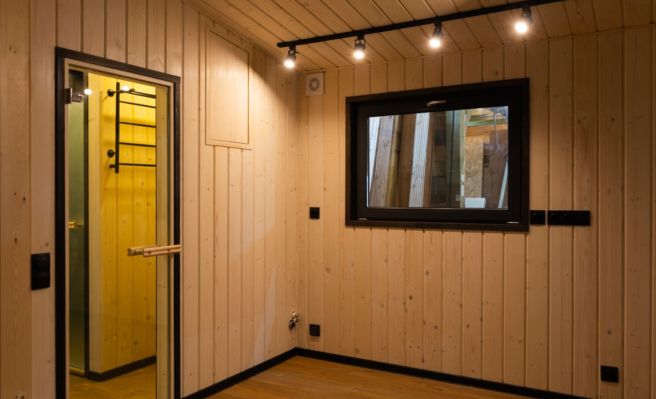 - Комната отдыха: вагонка штиль сорт АВ, 12x110. Без покраски. На полу доска пола хвоя, сорт АВ, покрыта Teknos Satu Saunasoja цвет на выбор.