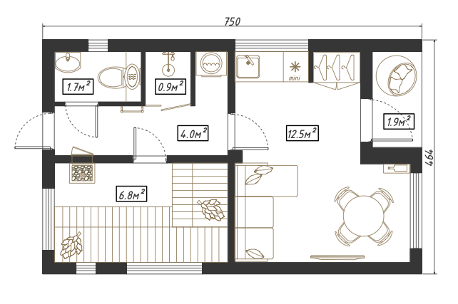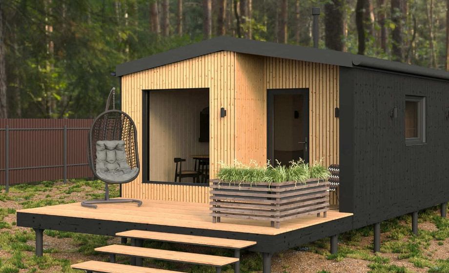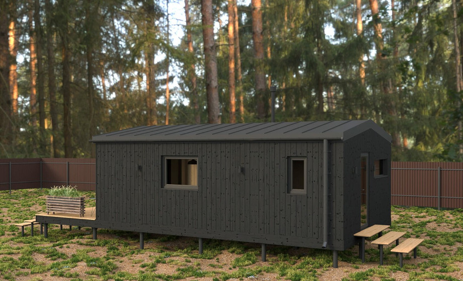 - Баня-дом с увеличенной парной, предбанником, душем, туалетом, кухней-гостиной и крыльцом BD2.30