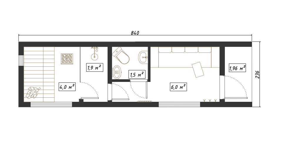- Баня с душевой, туалетом, комнатой отдыха и крыльцом B1.80