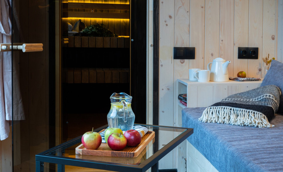 - Комната отдыха: вагонка штиль сорт АВ, 12x110. Без покраски. На полу доска пола хвоя, сорт АВ, покрыта Teknos Satu Saunasoja цвет на выбор.