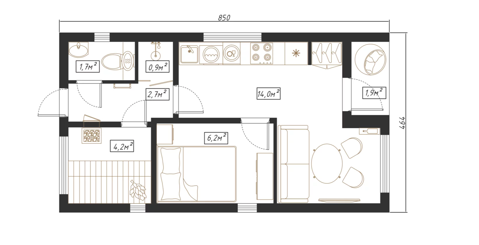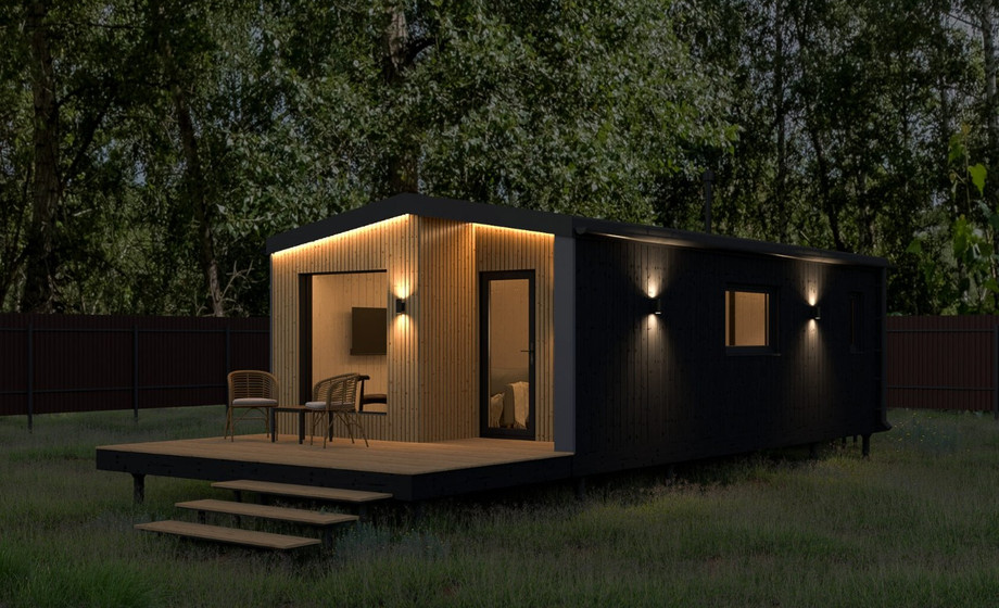 - Баня-дом c предбанником, душем, туалетом, кухней-гостиной, спальней и крыльцом BD2.50