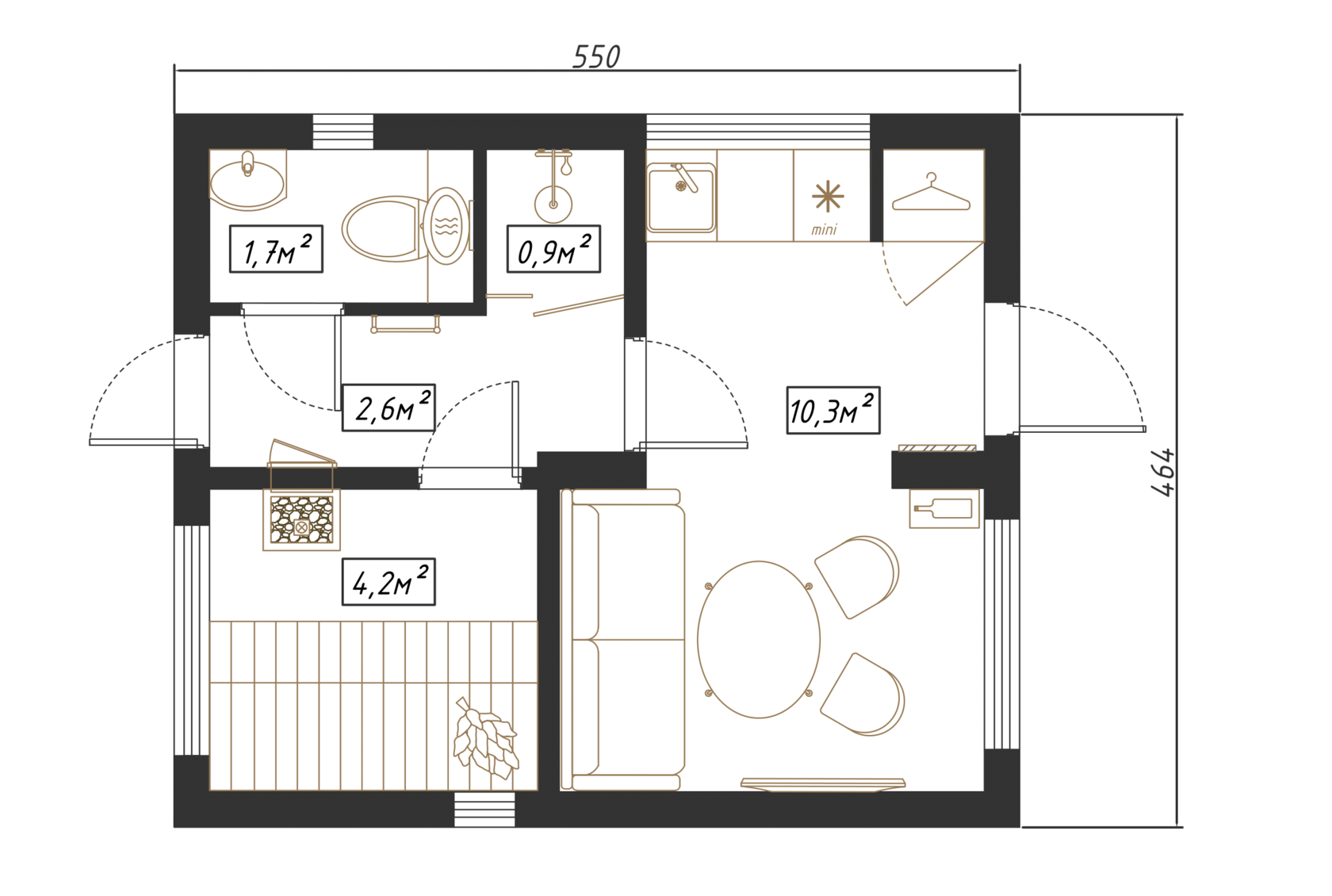 - Баня-дом c предбанником, душем, туалетом и кухней-гостиной BD2.10