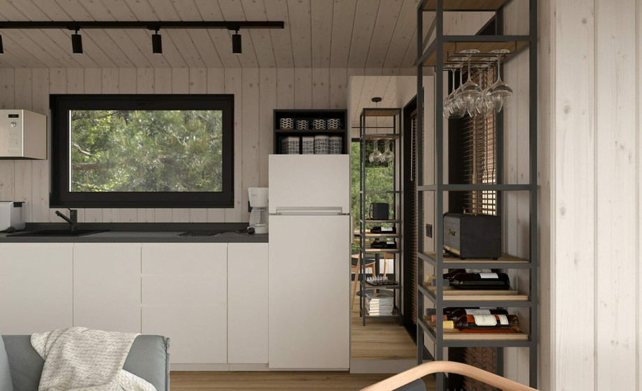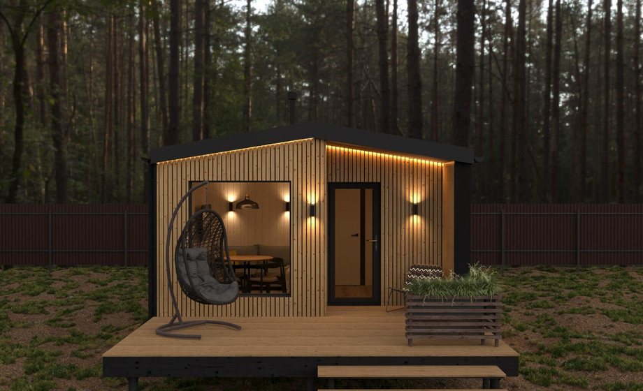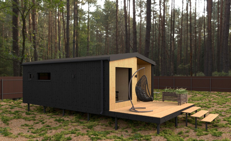 - Баня-дом с увеличенной парной, предбанником, душем, туалетом, кухней-гостиной и крыльцом BD2.30