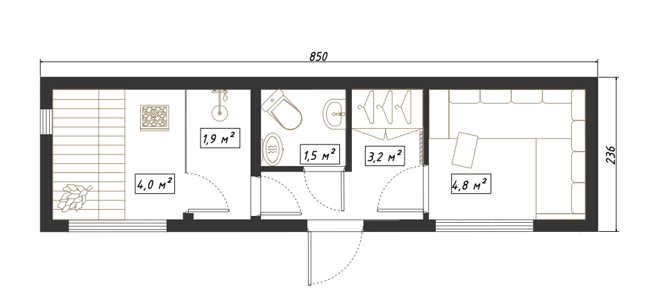 - Баня с душевой, туалетом, прихожей и комнатой отдыха B1.90